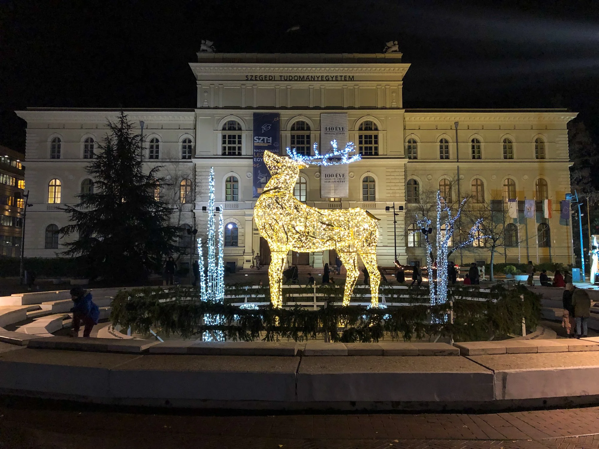 As in previous years, Dugonics Square serves as a popular Instagram spot with a large lit-up deer on top of the closed-down fountain, and a Santa Clause installation in front of the Rector's Building of the University of Szeged. Dugonics Square hosts a food and drink stall too, offering alcoholic and non-alcoholic hot drinks, as well as typical winter food like fried sausages in different versions, fried blood with onions (hagymás sült vér), and more.