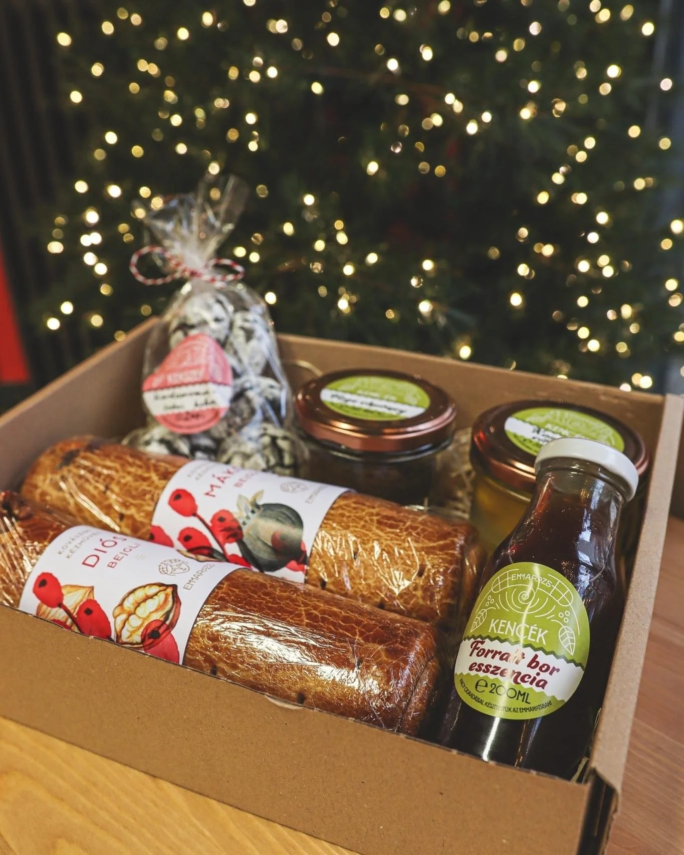 Quite a few places in Szeged offer gastro gifts for Christmas. Emmarozs, for example, offers a gift box in two versions, containing traditional handmade Christmas rolls called Bejgli with a twist: it's made with a special sourdough. Other specialties like quince chutney and duck rillettes - made at Emmarozs Deli - also pop into the boxes, as well as a bottle of Italian sparkling wine or a mulled wine essence, cookies, and meringue, depending on the box type. A third gift box offers a selection of cookie specialties.