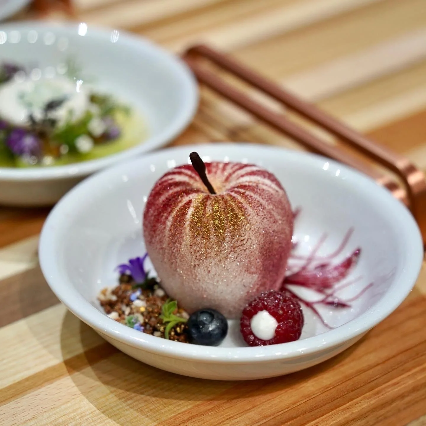 Roses made from pickled root vegetables, liquid potato, ramson, herbs, and aged cheese