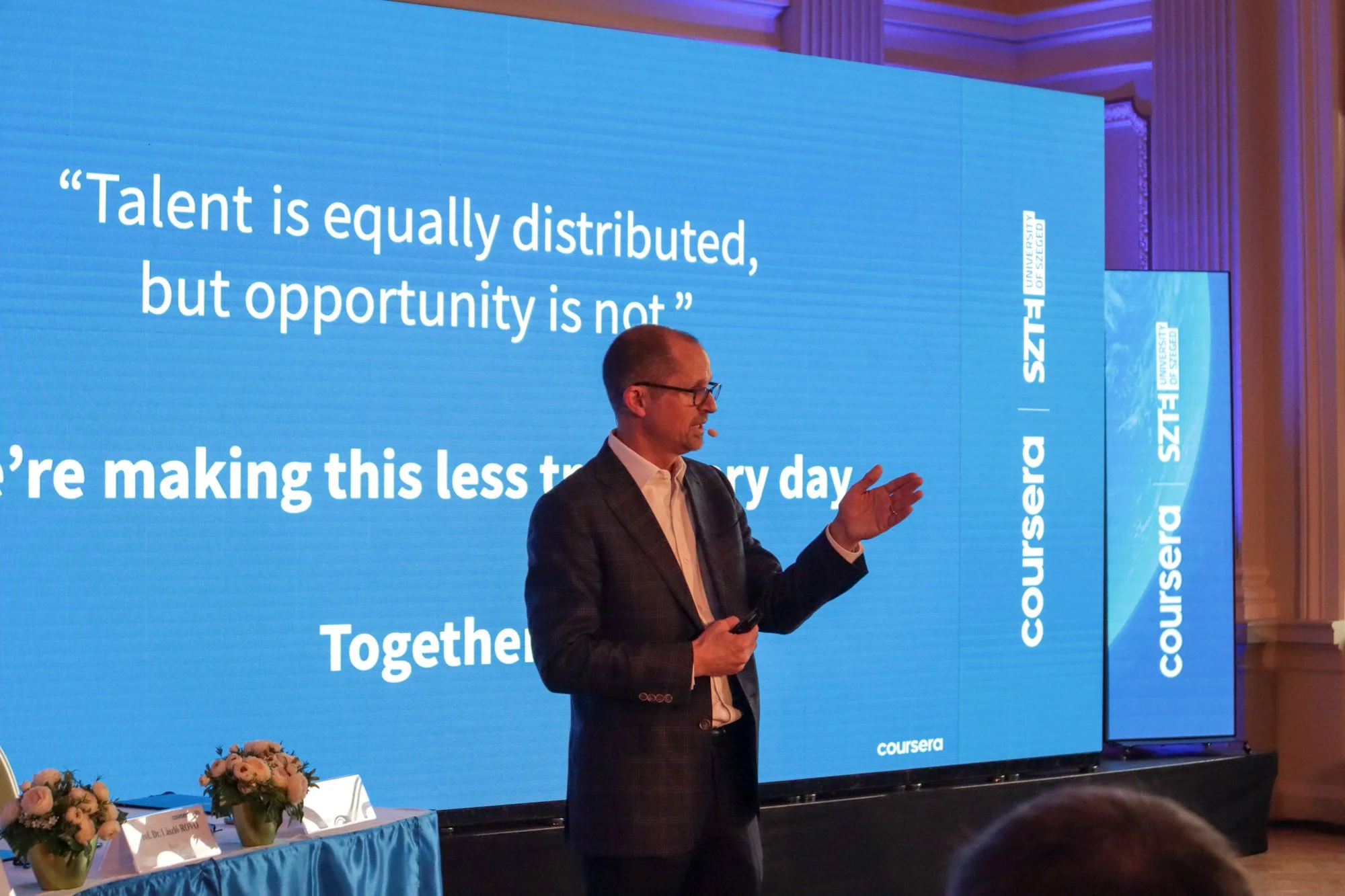 Jeff Maggioncalda spoke about how higher education has to adapt to the fast-changing digital world and that all conditions are given at the University of Szeged to keep pace with these changes. He also emphasized that both Coursera and SZTE strive to provide training that is suitable for the labor market and that this can be achieved most effectively by working together and in cooperation.
