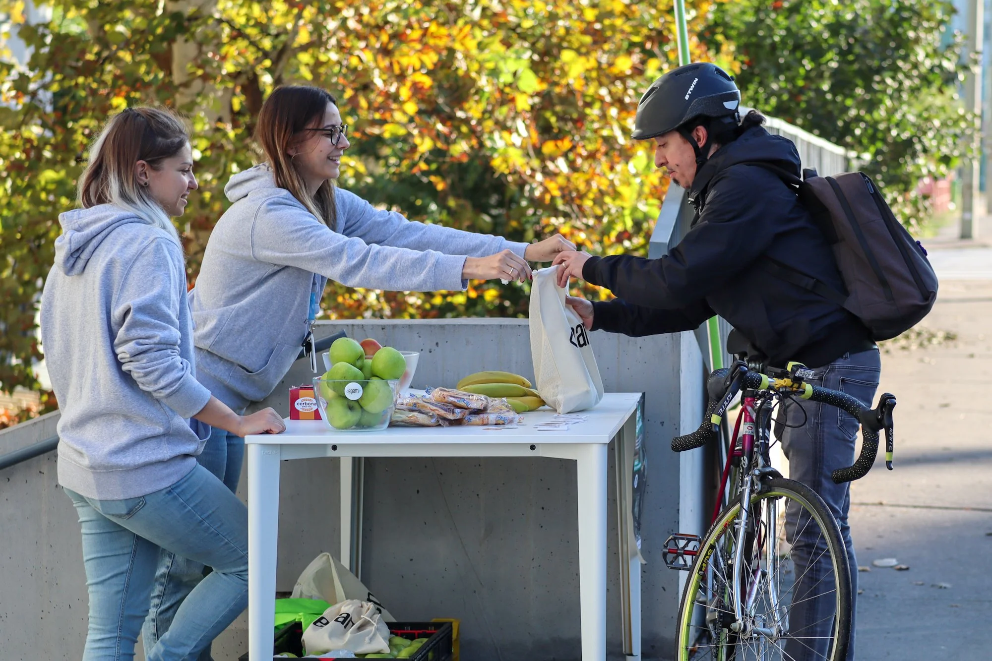 Free breakfast distributed to cyclists in front of the Epam office in Szeged on Tuesday, September 17. Szilvia Molnar / Szegedify