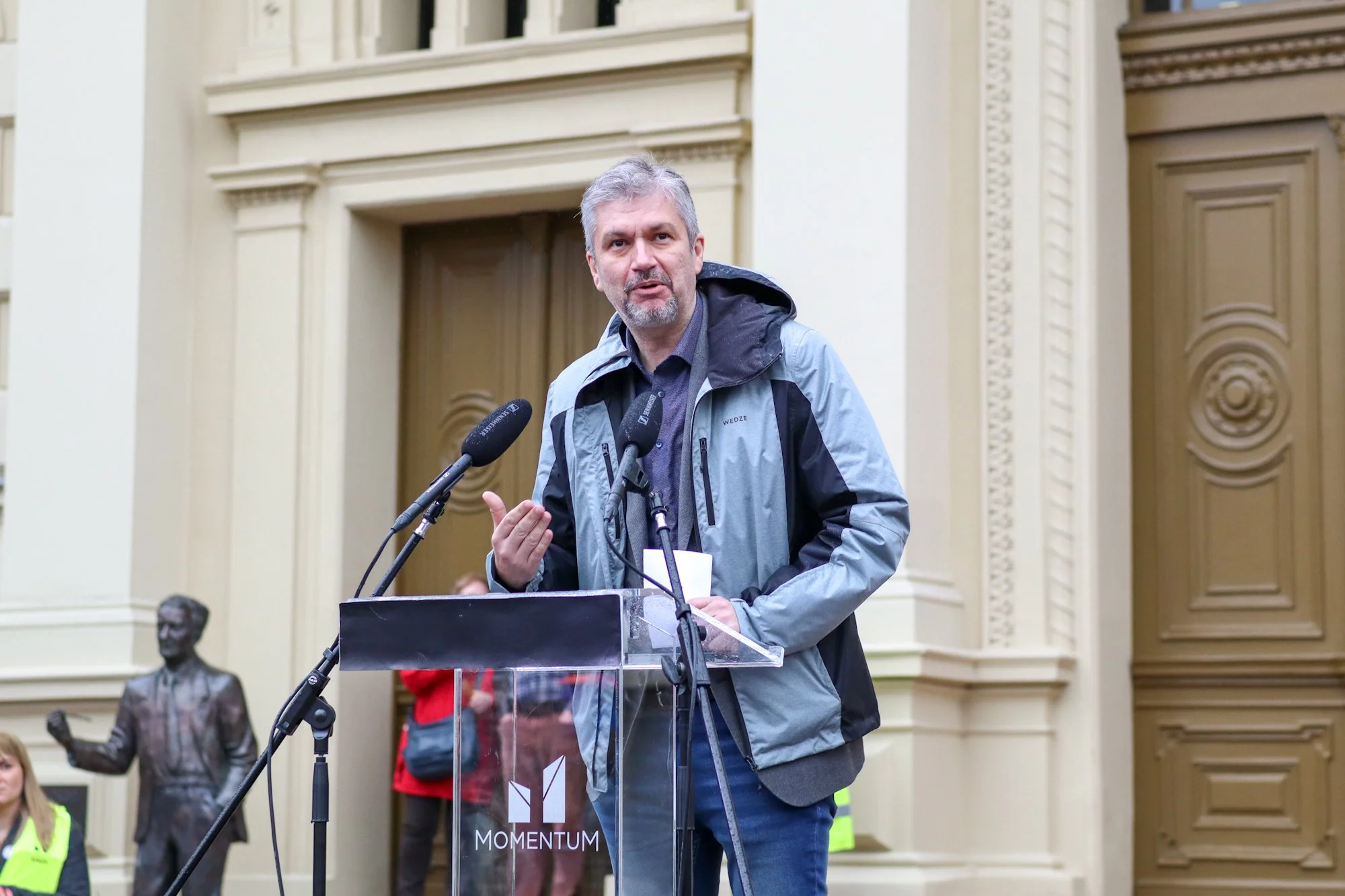 Speakers included Áron Varsányi, spokesperson for the Momentum Movement; Noémi Halász, head of Momentum’s Szeged chapter; psychologist Marina Tódor; independent MP Ákos Hadházy; and Momentum vice president Lajos Lőcsei.