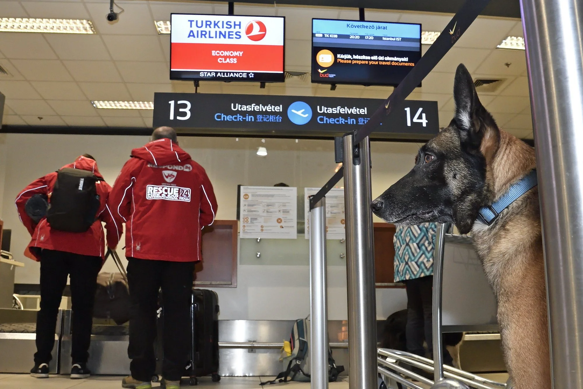 Budapest, February 6, 2023. Members of the Hungarian Baptist Aid special rescue team and one of their search dogs leaving for Turkey at Ferenc Liszt Airport. MTI/Péter Lakatos